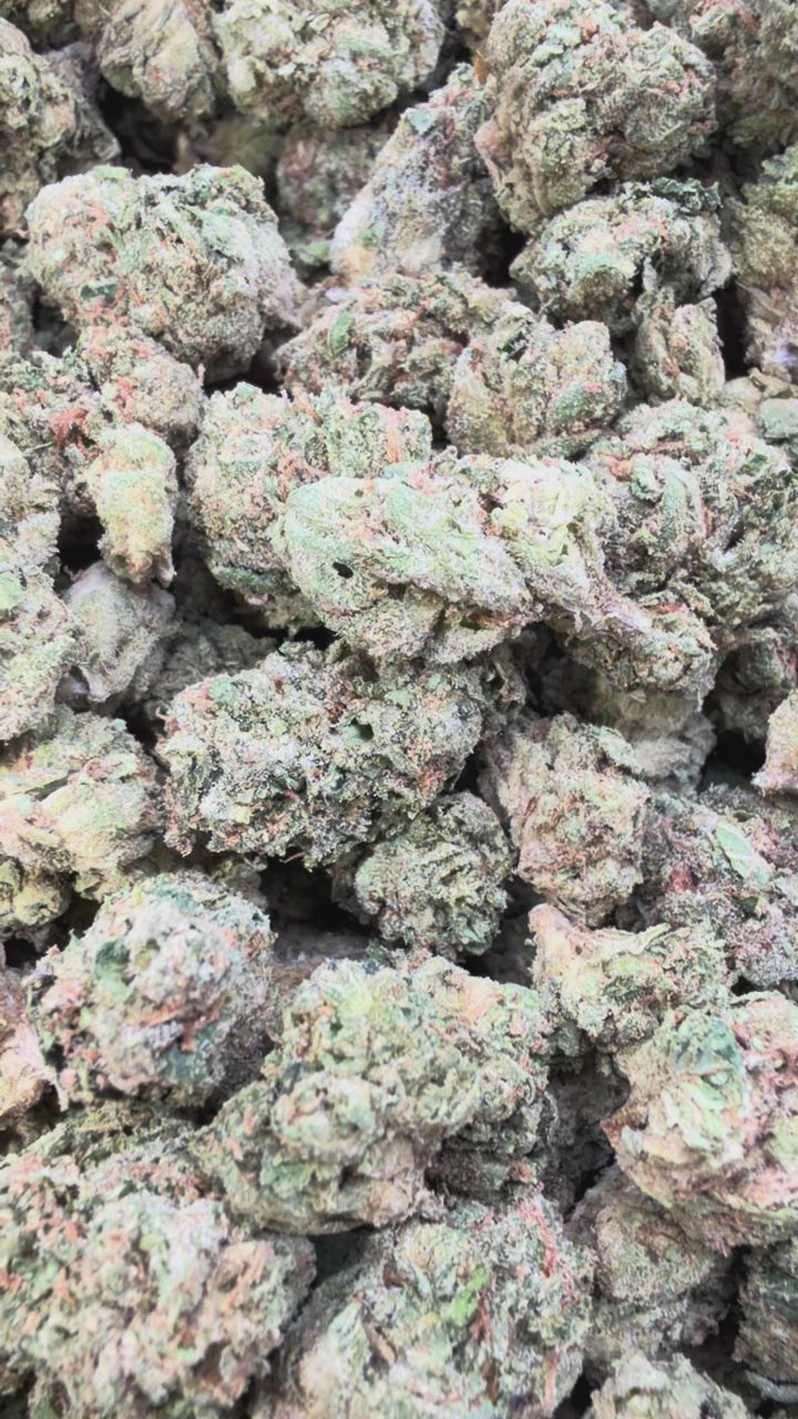 Deep red and purple hues with sticky trichomes, chunky structure, and bright orange hairs. Smells like red candy and rich fruit dipped in kushy cream.