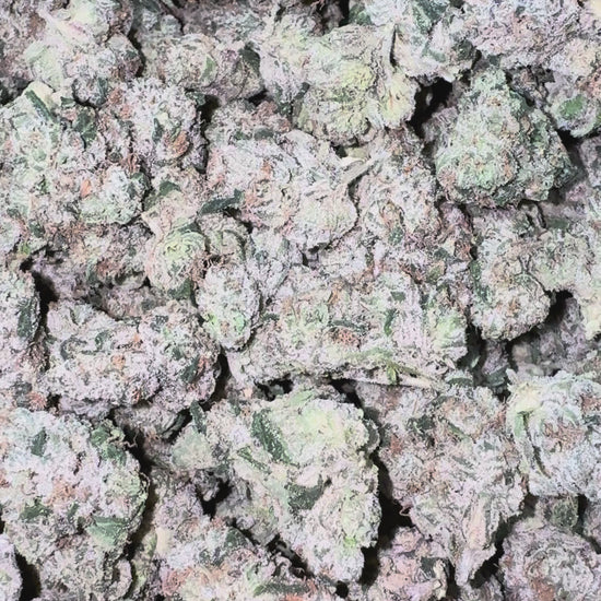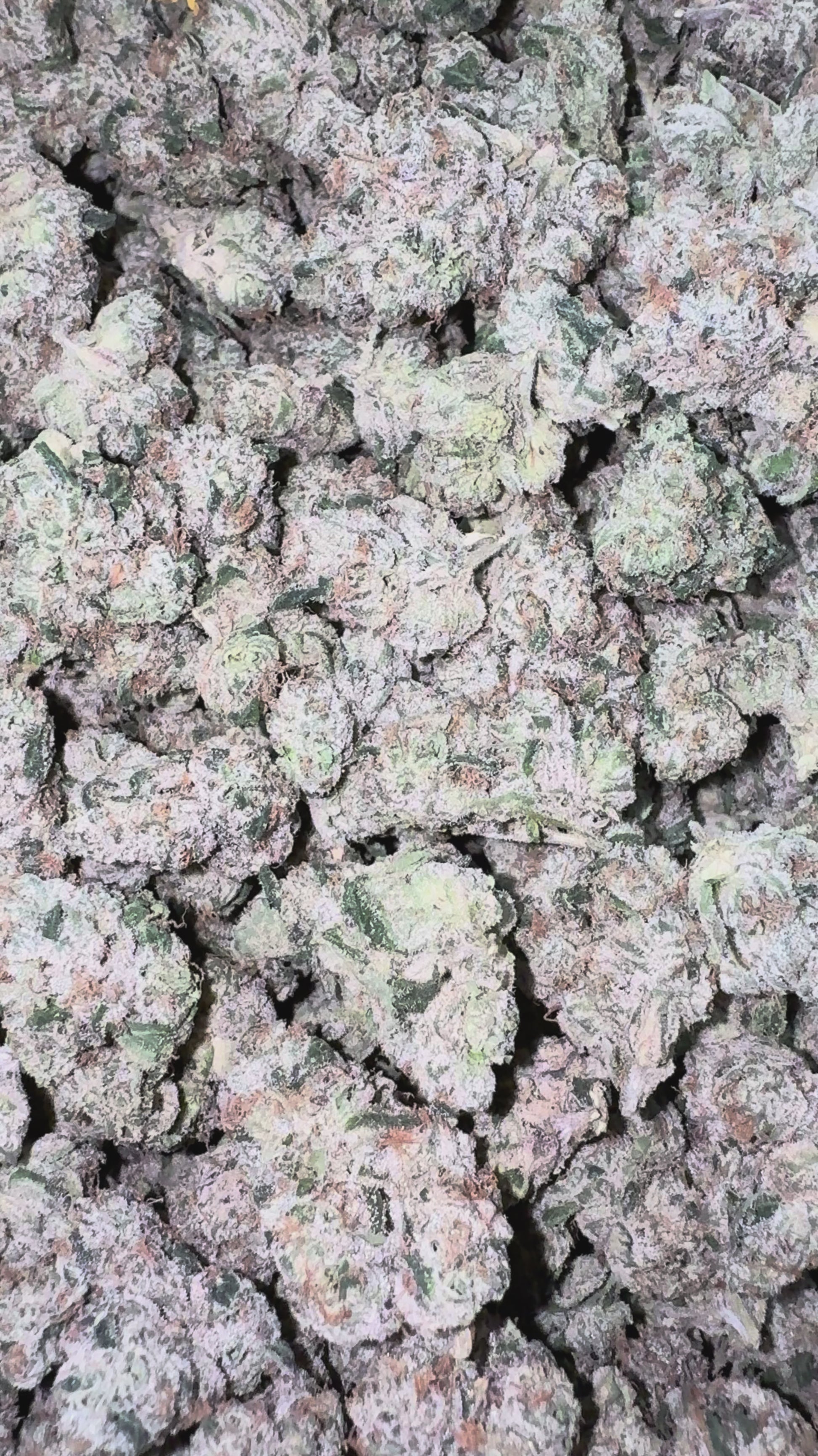 💎 Dense, frosty buds with neon-green hues 💚, deep purple shades 💜, fiery orange hairs 🧡, and a thick blanket of sparkling trichomes ❄️.