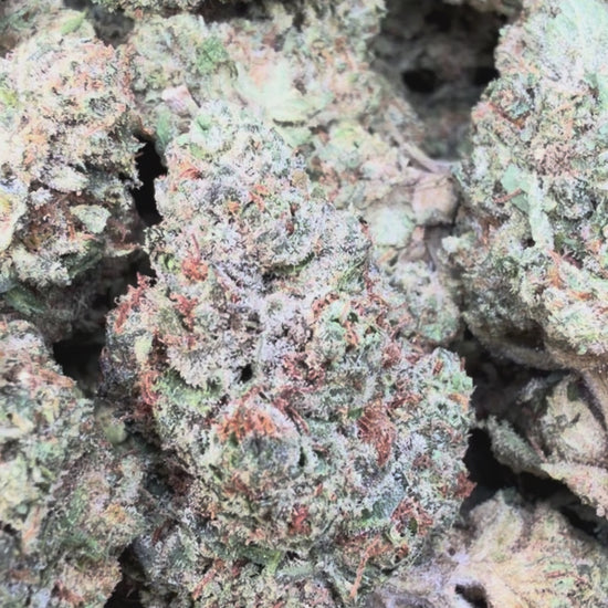 Dense, sticky buds with purple streaks, thick trichomes, and dark green tones. Pungent gas hits first, followed by sweet, earthy cookie dough and creamy funk.