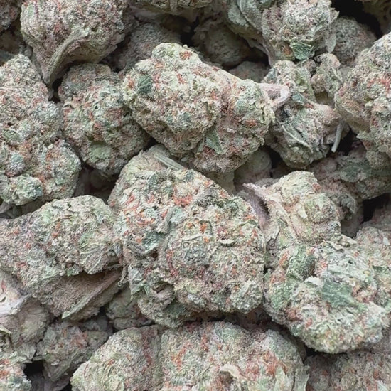 Dense, crystal-covered buds with rich green hues, bright orange hairs, and thick trichome frost. Pungent, sweet-and-gassy aroma that lingers.