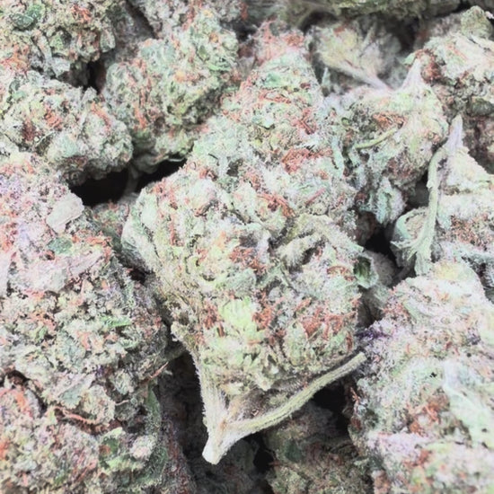Dense, frosty buds with bright green and occasional purple hues. Sticky with heavy trichomes and a sweet, minty aroma.