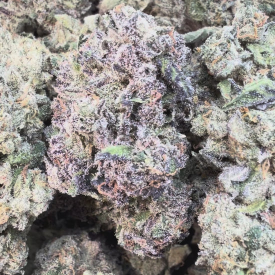 Dense, frosty buds with green and purple tones and sticky resin. Smells fruity at first, then opens into diesel-gas funk.