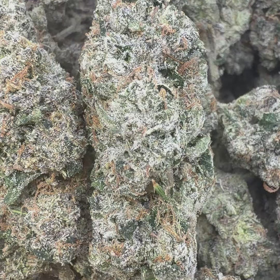 Deep red and purple hues with sticky trichomes, chunky structure, and bright orange hairs. Smells like red candy and rich fruit dipped in kushy cream.