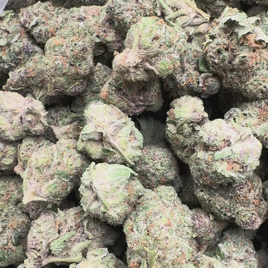 Bright green buds with purple streaks, orange hairs, and dense trichomes. The smell is loud—tropical candy with creamy funk underneath.