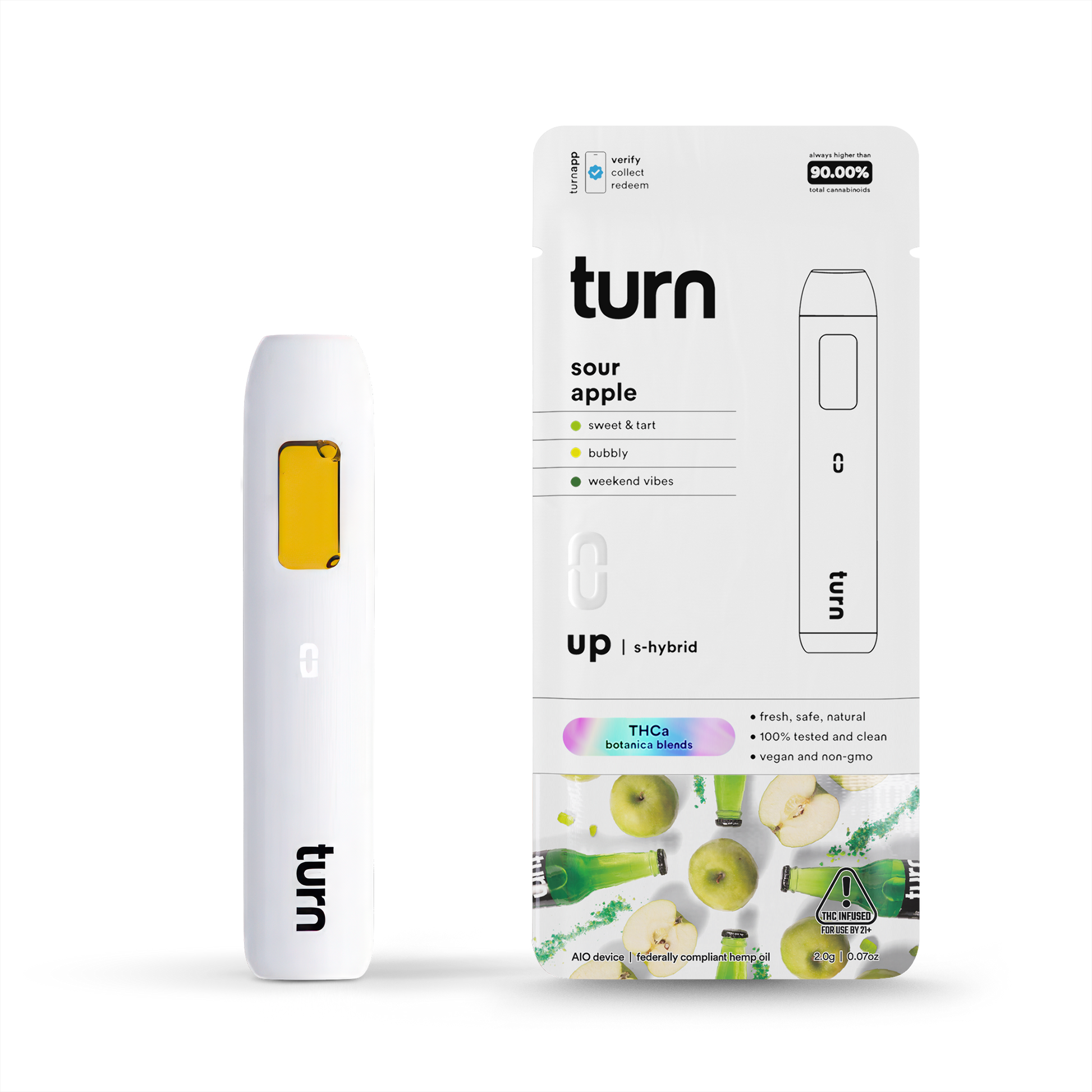 Experience the smooth and creamy flavor of the Turn Sour Apple Seltzer disposable vape. This 2-gram indica vape delivers a balanced mix of uplifting energy and full-body relaxation. Sour Apple Seltzer stands out with its sweet, dessert-like flavors and calming effects, making it an ideal choice for unwinding after a long day or for any time you want to relax without feeling too sedated.